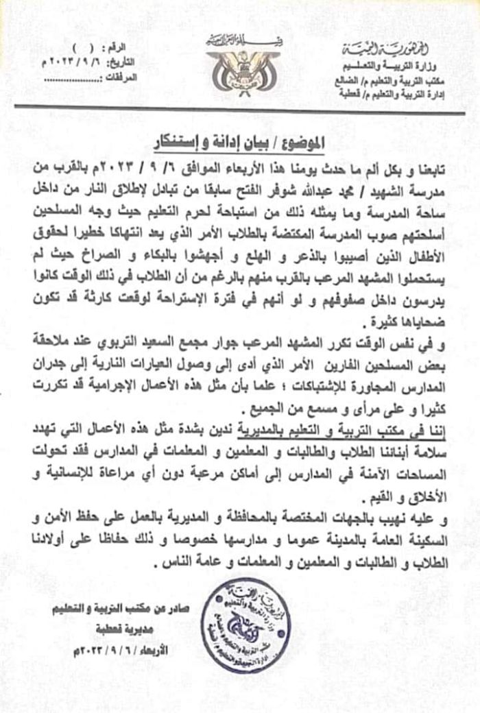 وقال مكتب التربية والتعليم في قعطبة، في بيان الاربعاء 6 سبتمبر/ أيلول 2023م، إن حادثة تبادل إطلاق النار التي وقعت في الاربعاء، في ساحة مدرسة الشهيد/ محمد عبدالله شوفر (الفتح سابقاً)، ووجه المسلحين خلالها أسلحتهم صوب المدرسة المكتضة بالطلبة تسبب لهم بحالة من الذعر والهلع والاجهاض بالبكاء.