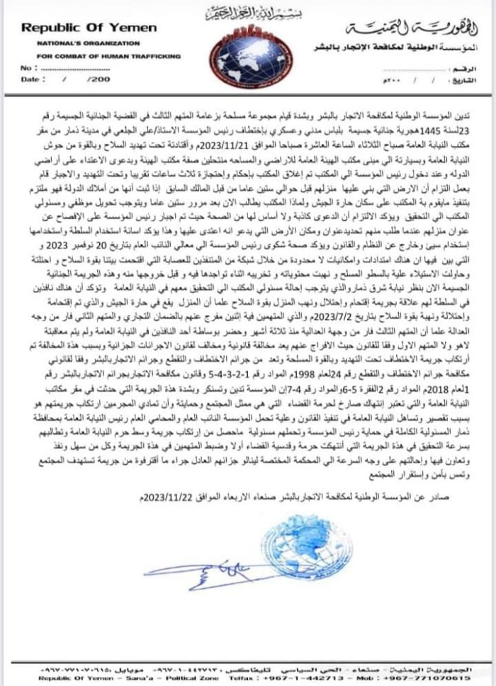 اليمن.. مكافحة الاتجار بالبشر تدين اختطاف عصابة لرئيسها من النيابة العامة وإجباره على توقيع تنازل عن منزله