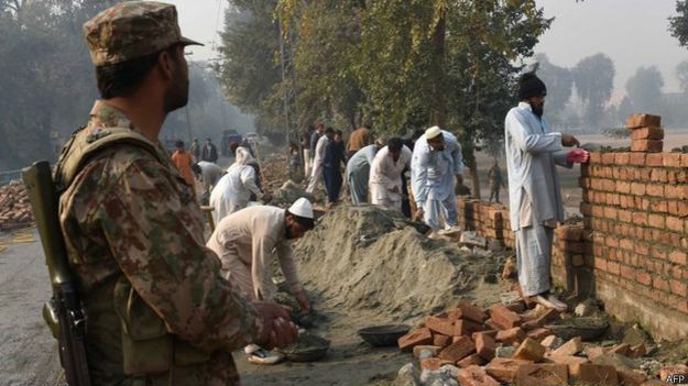 عمال باكستانيون يعيدون بناء جدار المدرسة التي تعرضت للهجوم